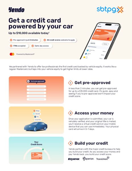 Santa Barbara Tax Products Group 9 months agoYendo – Nuevo producto para ayudar a quienes necesitan una tarjeta de credito usando el capital de su automovil. Check it out!